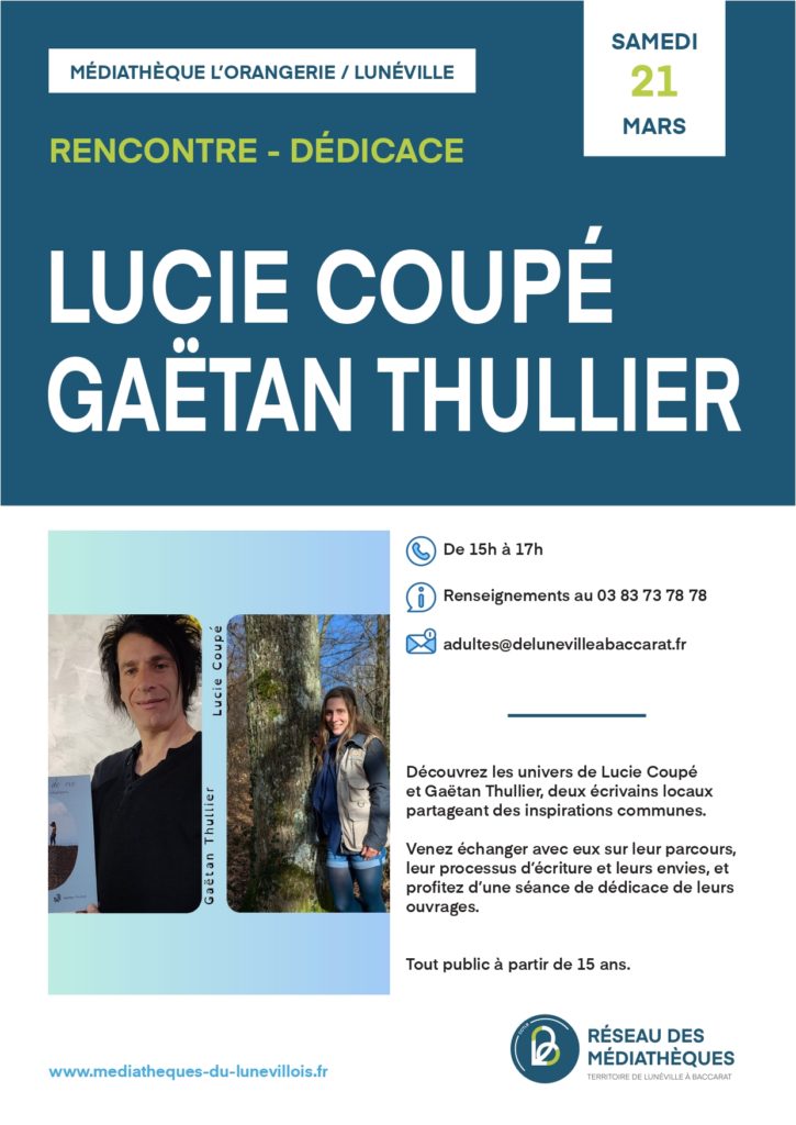 Le samedi 21 mars, la Médiathèque de l’Orangerie à Lunéville propose un temps de rencontre et de dédicace, où vous aurez l’occasion de découvrir les univers de Gaëtan Thullier, ainsi que le mien. Nous sommes deux écrivains et poètes locaux partageant des inspirations communes.