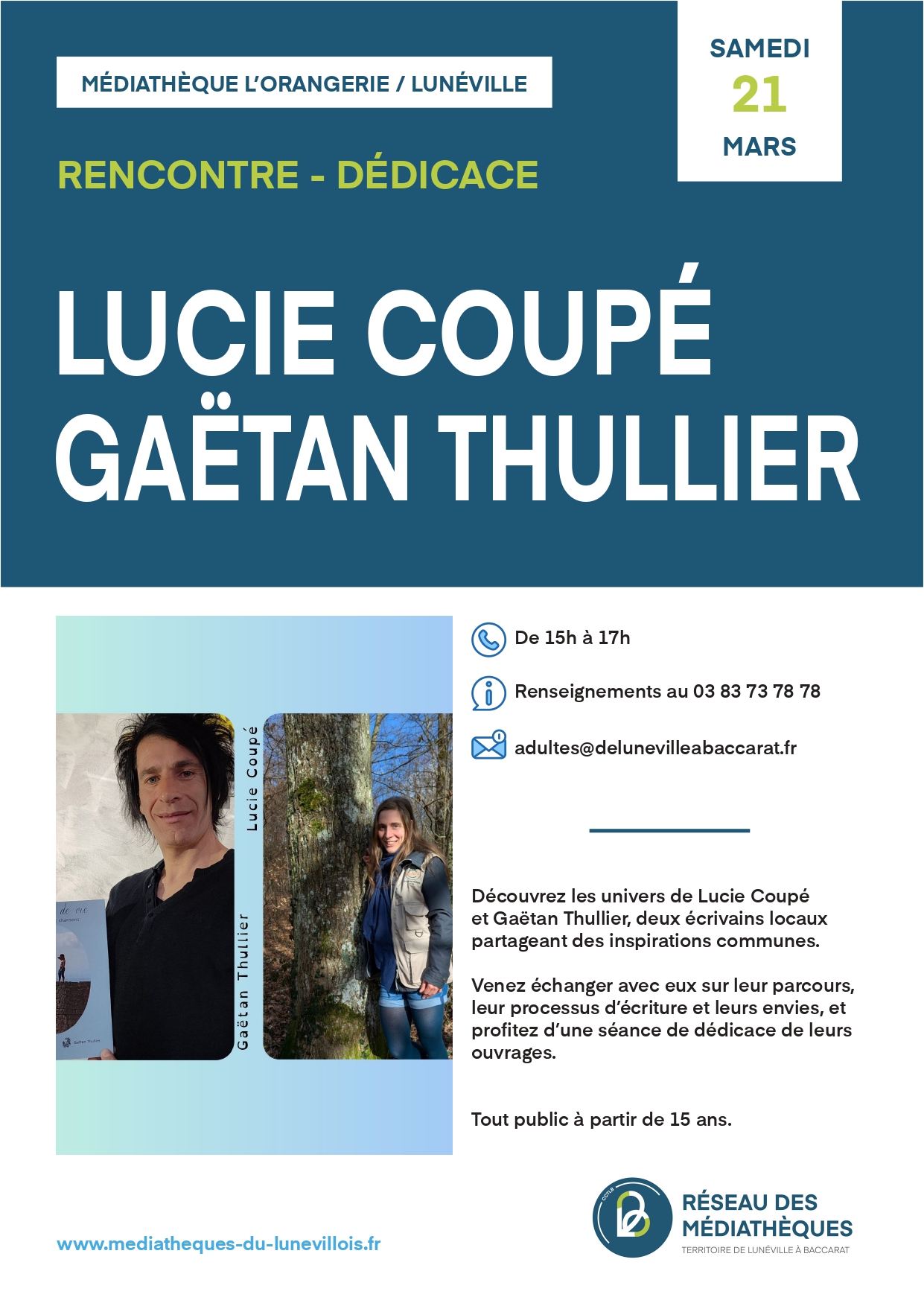 Médiathèque de l'Orangerie (Lunéville-54)Le samedi 21 mars, la Médiathèque de l'Orangerie à Lunéville propose un temps de rencontre et de dédicace, où vous aurez l'occasion de découvrir les univers de Gaëtan Thullier, ainsi que le mien. Nous sommes deux écrivains et poètes locaux partageant des inspirations communes. La rencontre aura lieu de 15h00 à 17h00. La médiathèque se […]